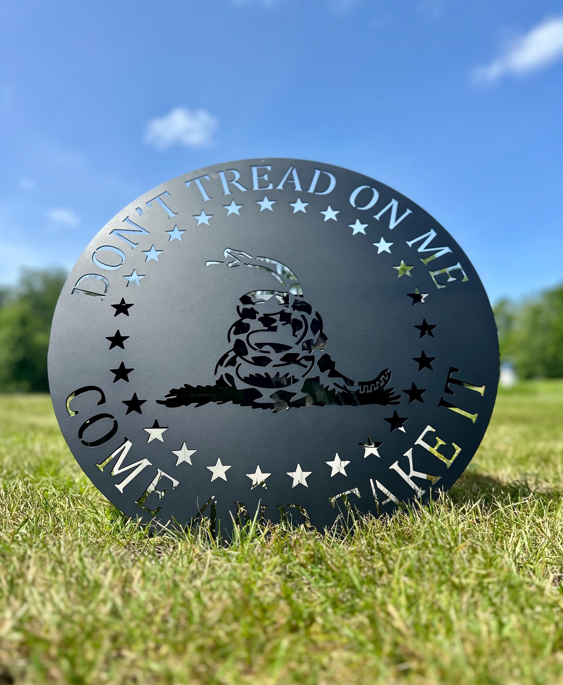 Make a bold statement with our Don’t Tread on Me metal wall sign, featuring a clean, CNC-cut design inspired by the iconic Gadsden flag. Each sign is CNC plasma cut from steel and powder coated in-house for a durable, long-lasting finish built to withstand both indoor and outdoor environments.